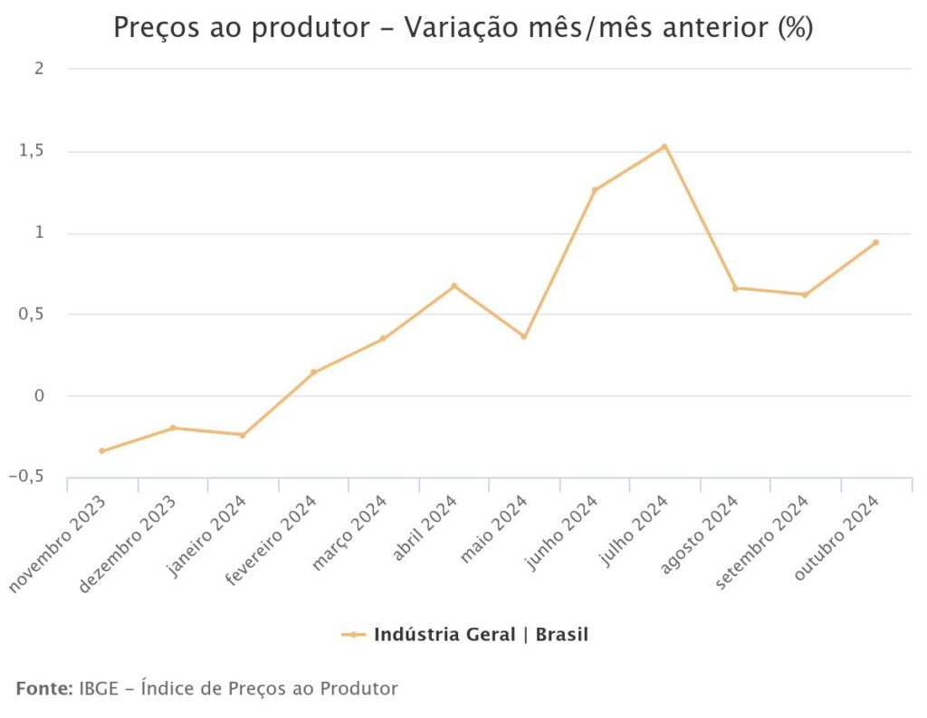 Pela nona vez seguida os preços da indústria nacional registraram crescimento, com ganho de 0,94% em outubro de 2024 frente a setembro último. O Índice de Preços ao Produtor (IPP), assim, acumula alta de 5,89% em 12 meses, enquanto o acumulado no ano ficou em 6,46%. Em outubro de 2023, a taxa mensal havia sido […]